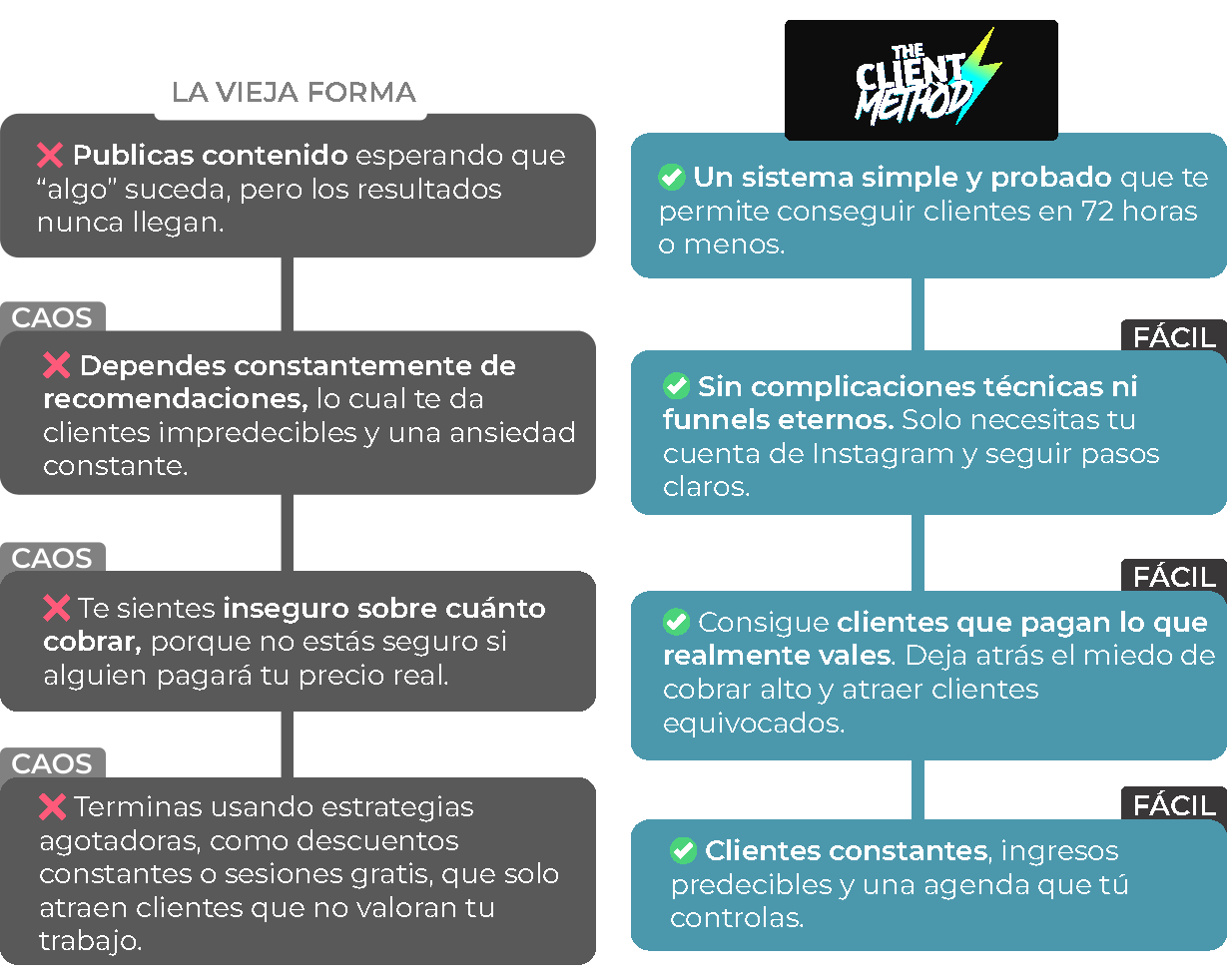No garantizamos resultados específicos ni niveles concretos de ingresos, y no nos hacemos responsables por las acciones que tomes basadas en la información proporcionada en este producto. Al adquirir The Client Method, reconoces que cualquier emprendimiento conlleva un riesgo inherente, y asumes la responsabilidad total sobre esos riesgos. Recomendamos que realices tu propia investigación y consultes con un profesional cualificado antes de tomar decisiones empresariales o financieras.