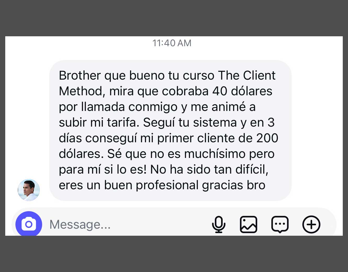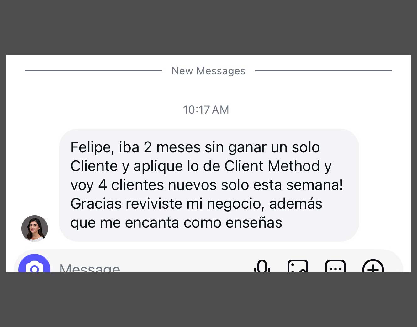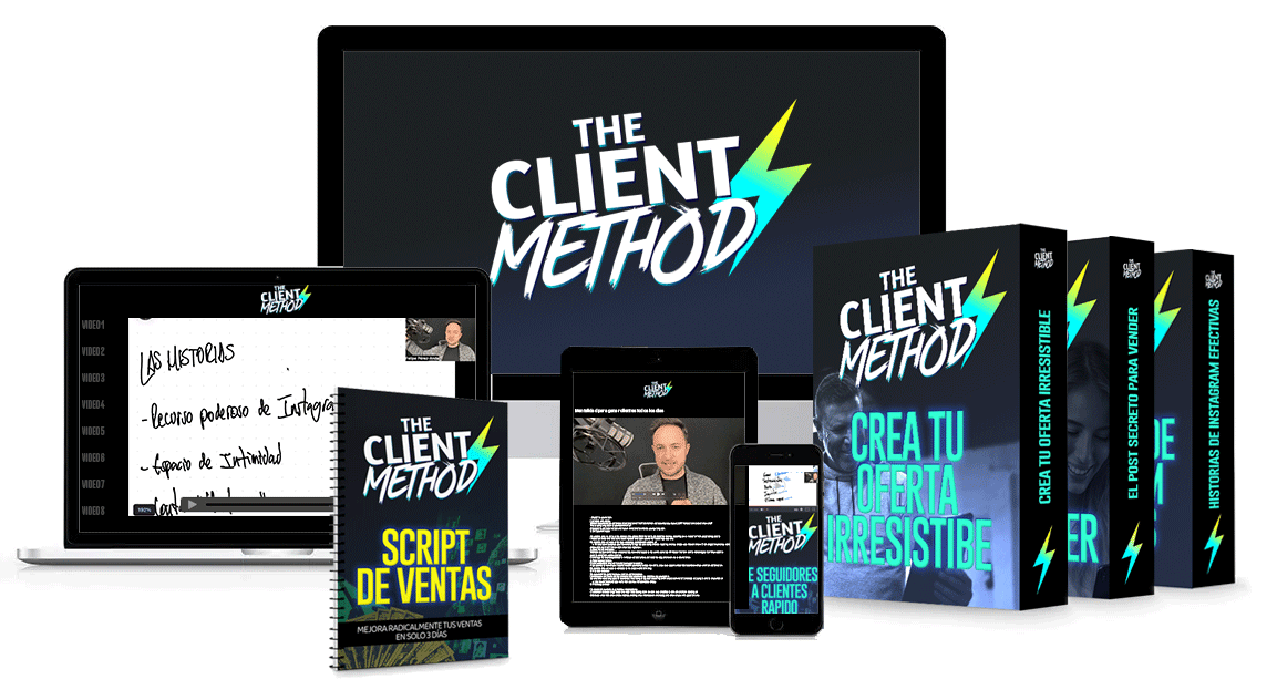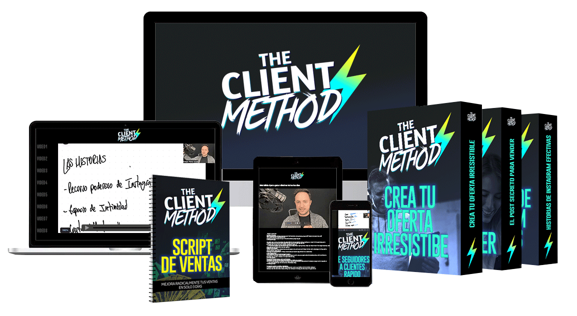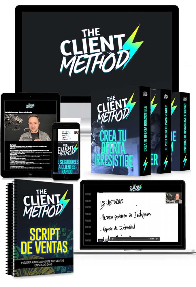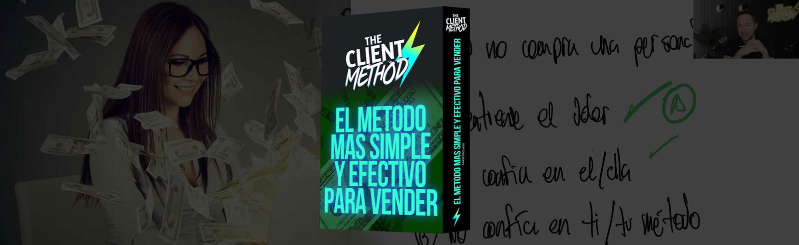 Los ejemplos de ingresos y resultados mostrados en The Client Method están basados en diversas experiencias reales, pero no son necesariamente típicos para todas las personas. Dichos resultados se presentan únicamente para mostrar el potencial del método. Tu éxito dependerá exclusivamente del esfuerzo, tiempo, recursos y compromiso que inviertas al aplicar el método.